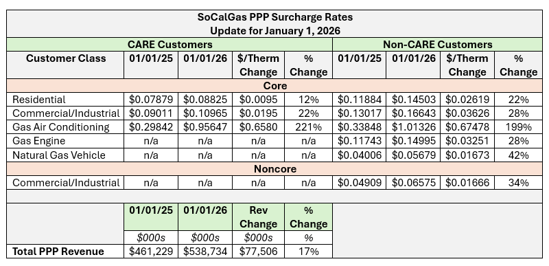 SoCalGas filed Advice Letter 6552-G (available here) to update its Public Purpose Program surcharge rates effective January 1, 2026. The update is required annually under a 2004 CPUC decision (D.04-08-010) and Assembly Bill 1002, which direct the Commission to establish a natural gas surcharge to fund energy efficiency, low-income assistance, and research & development programs.