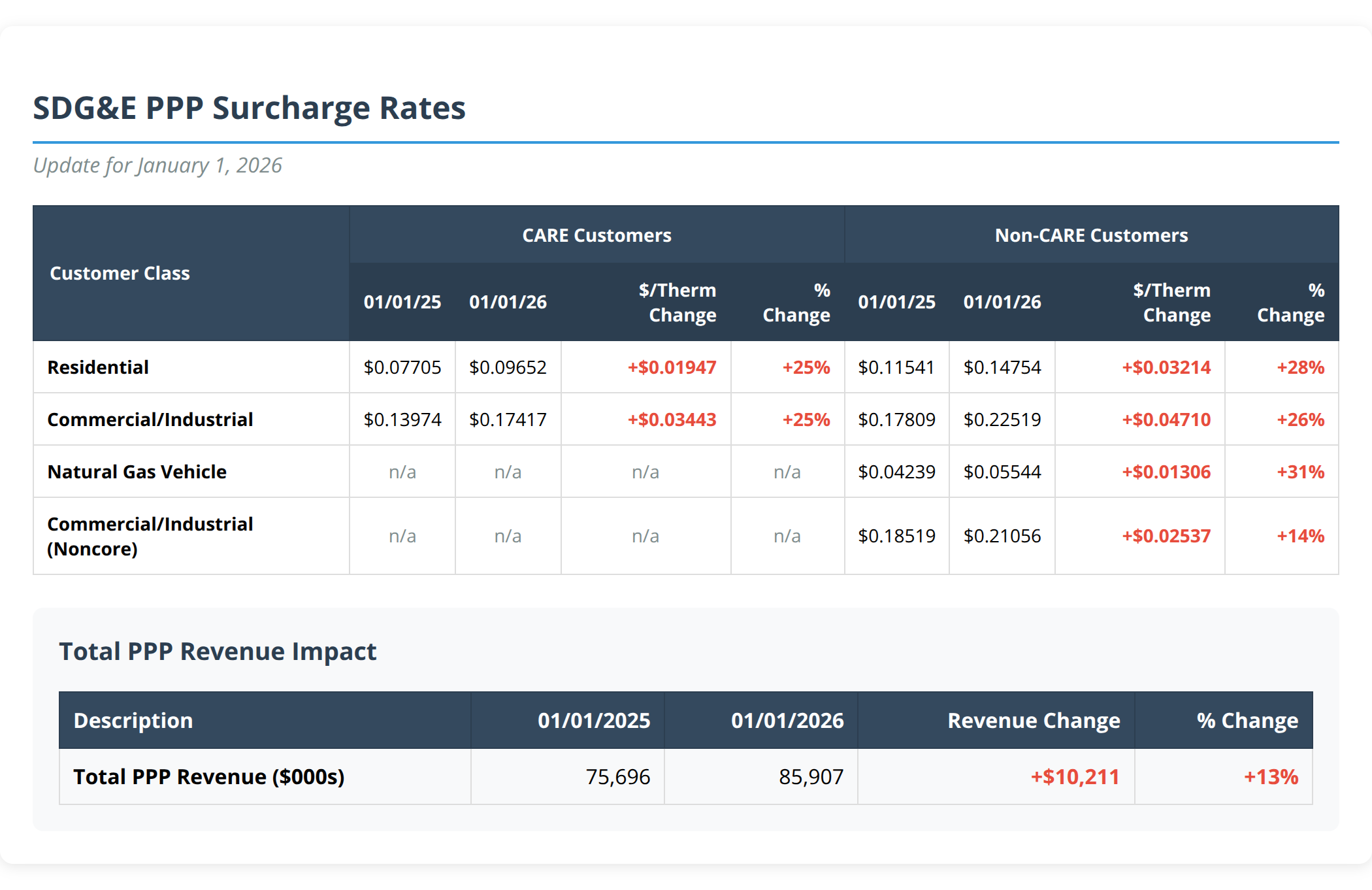 SDG&E's updated surcharge rates will take effect January 1, 2026. SDG&E proposes to increase PPP revenue recovery to $85.9 million (up about $10.2 million from 2025). Major cost drivers include: