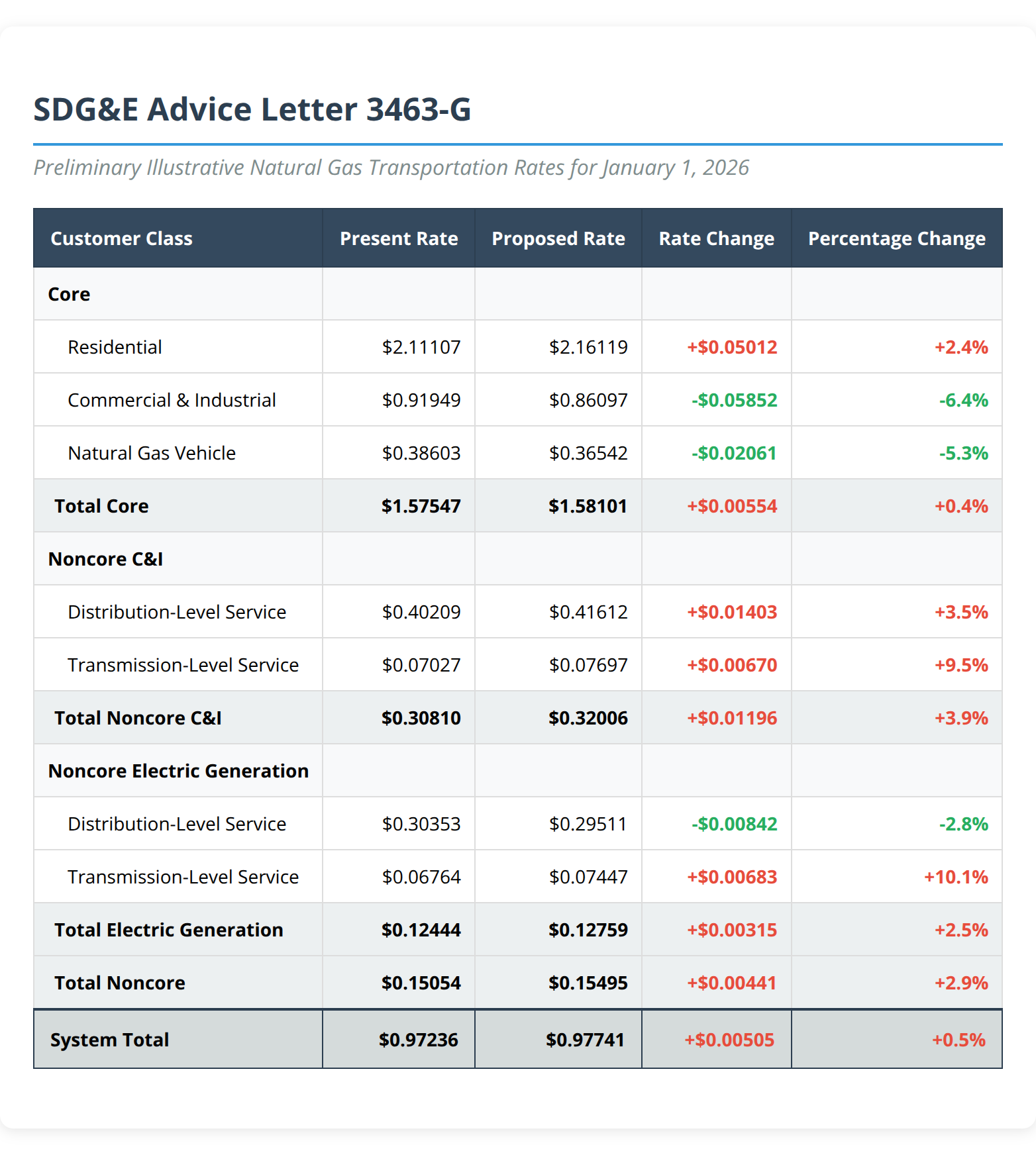 SDG&E filed Advice Letter 3463-G (available here) to update its natural gas transportation rates effective January 1, 2026.