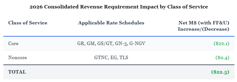 Core customers account for the bulk of the reduction ($22.1 million), with a smaller decrease for noncore customers ($0.4 million), partially offset by updated cost allocations from SoCalGas and harmonization of certain rates across the two utilities.