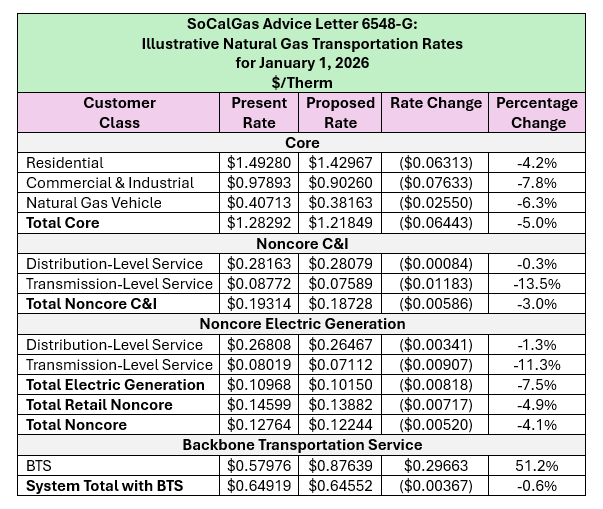 SoCalGas recently filed Advice Letter 6548-G (available here), its Annual Regulatory Account Balance Update, which projects the company’s revenue requirement and natural gas transportation rates, effective January 1, 2026.